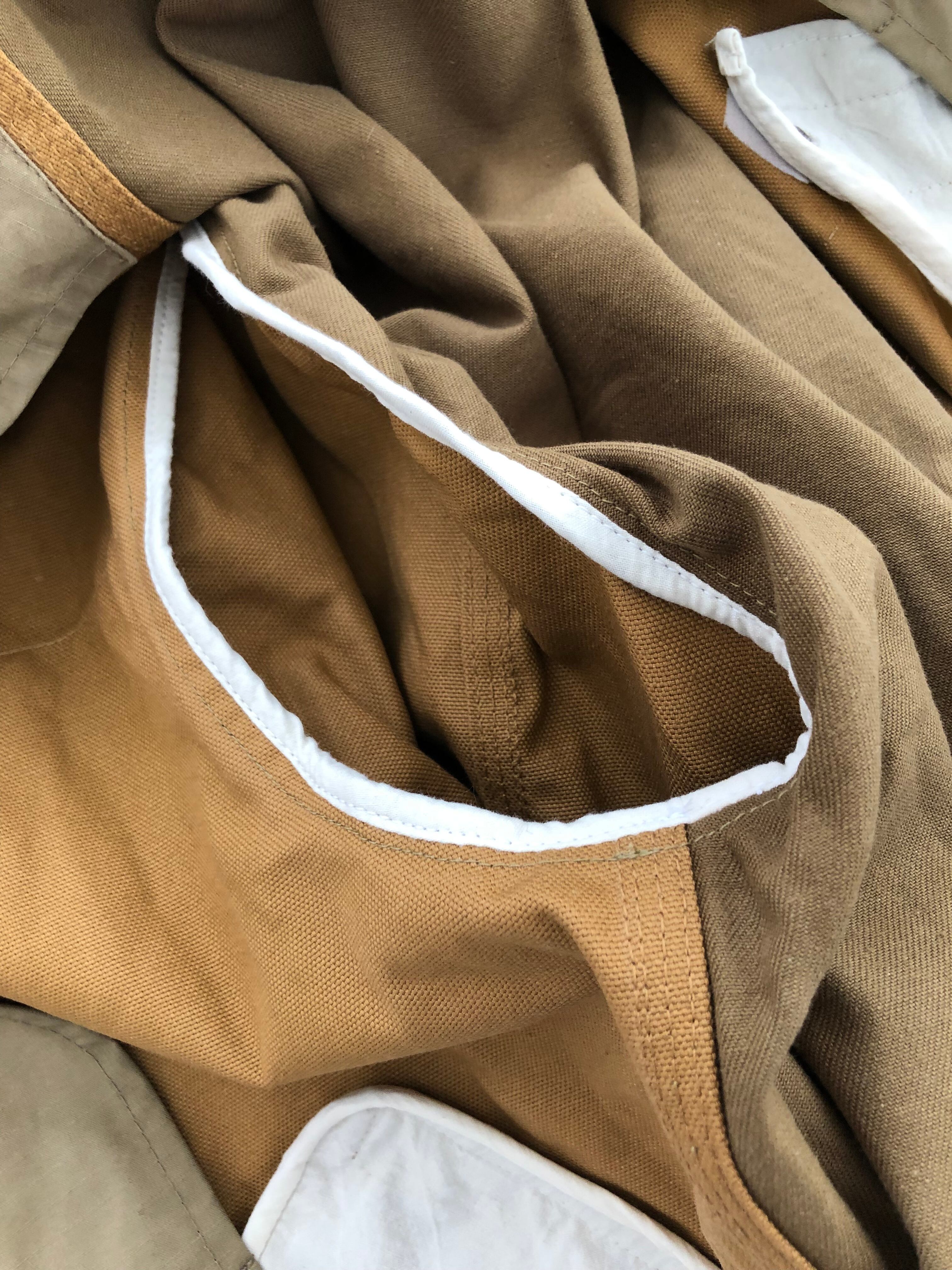 腕ぐりや内側のポケットにはパイピングで丁寧に処理しております。